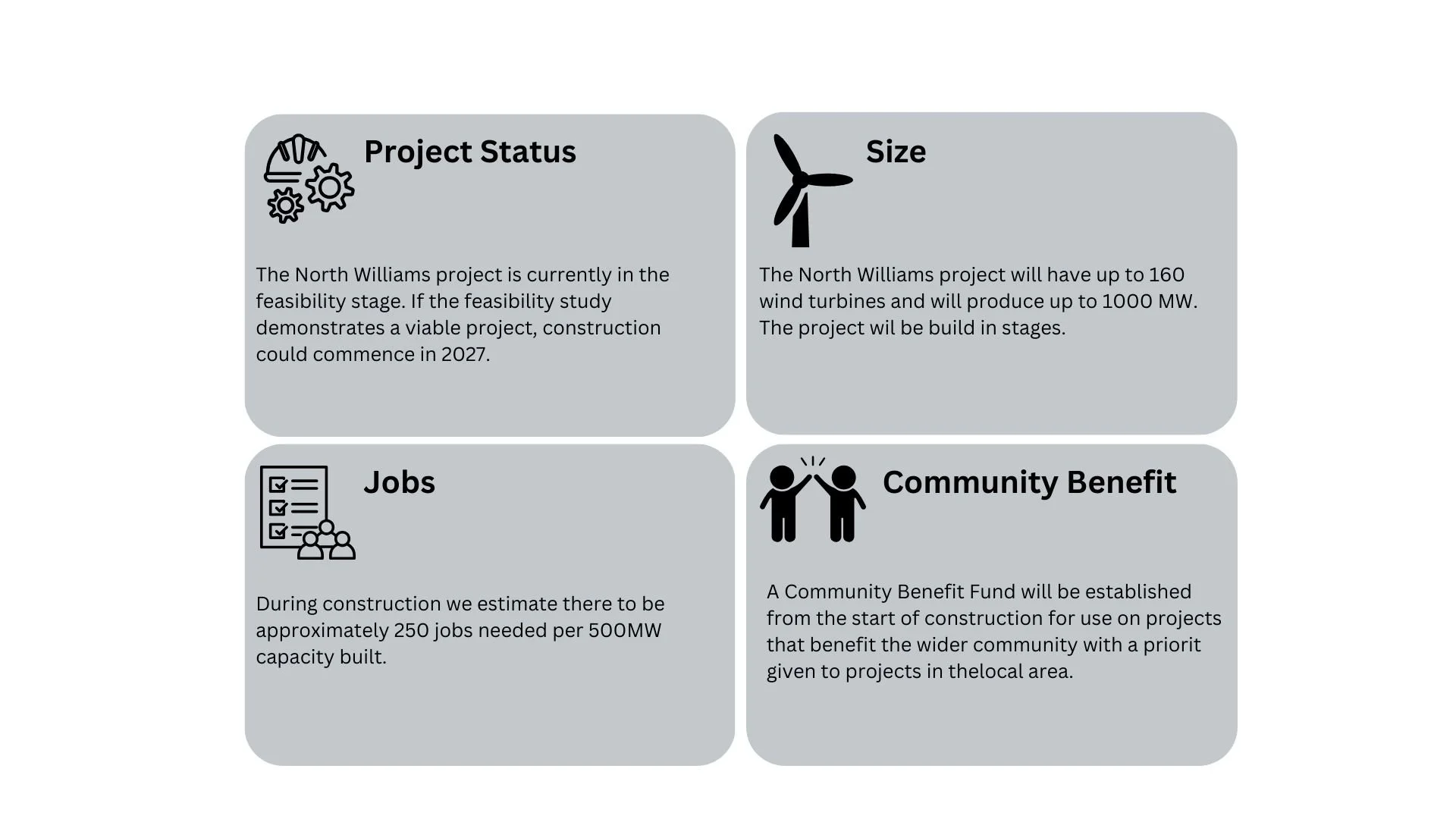 The proposed North Williams Wind Farm project is located approximately 10 to 20km north of Williams, in Western Australia. The wind farm is currently in the feasibility phase with work being undertaken on the technical, environmental, social, and economic aspects of the project. The feasibility study will assess a wind farm project consisting of up to approximately 120 - 150 wind turbines when fully constructed.
